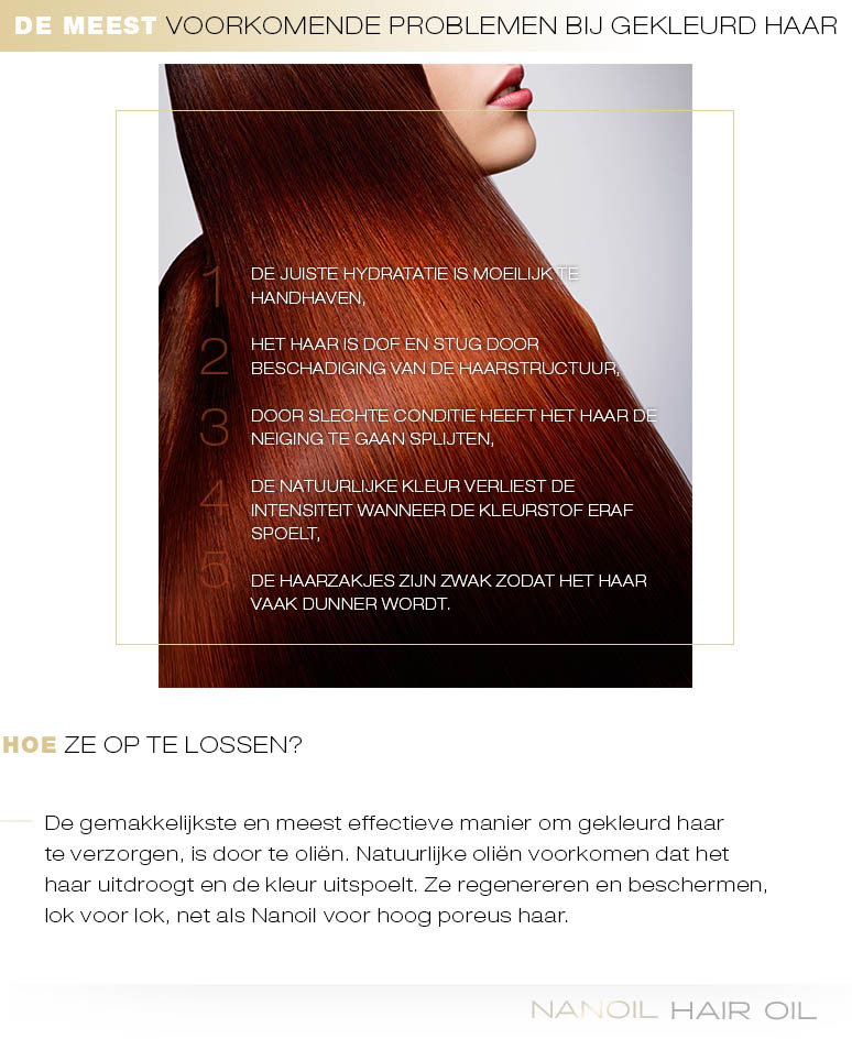 Voor haar met een hoge poreusheid is Nanoil Hair een goede optie. Het regelmatig oliën van gekleurd haar versterkt het haar, verlengt de levensduur van de kleur en biedt extra bescherming. Oliën hebben een voordeel ten opzichte van andere haarverzorgingsproducten, omdat ze voldoen aan de eisen die eigen zijn van het haar. Ze verfijnen de glans, stimuleren de gladheid, voorkomen dat de schubbenlaag omhoog komt en beschermen tegen zonnestralen en hitte. De behandeling met haarolie is dan ook de meest eenvoudige en doeltreffende techniek om de kleur en de gezondheid van het haar te behouden.